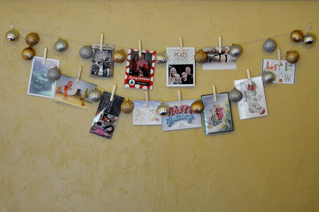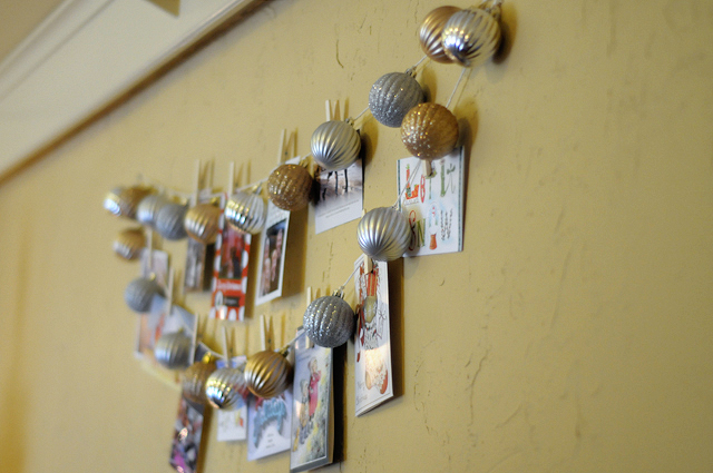 Basically all I did was tie the kitchen twine around the little hanger part of each ornament about 5-6 inches apart, alternating the colors.  I think it took me a grand total of 20 minutes and a glass of wine to do it all, and then figure out how you want to hang it on the wall.  I would have done mine in one big long string, but there were already holes in the wall in our rental house so I just made due with those.  I actually like the doubled-up look though!  As the cards flood in just clip ’em on the string in between ornaments  and voila!  A card display that keeps your mantel free of clutter and cost practically nothing!